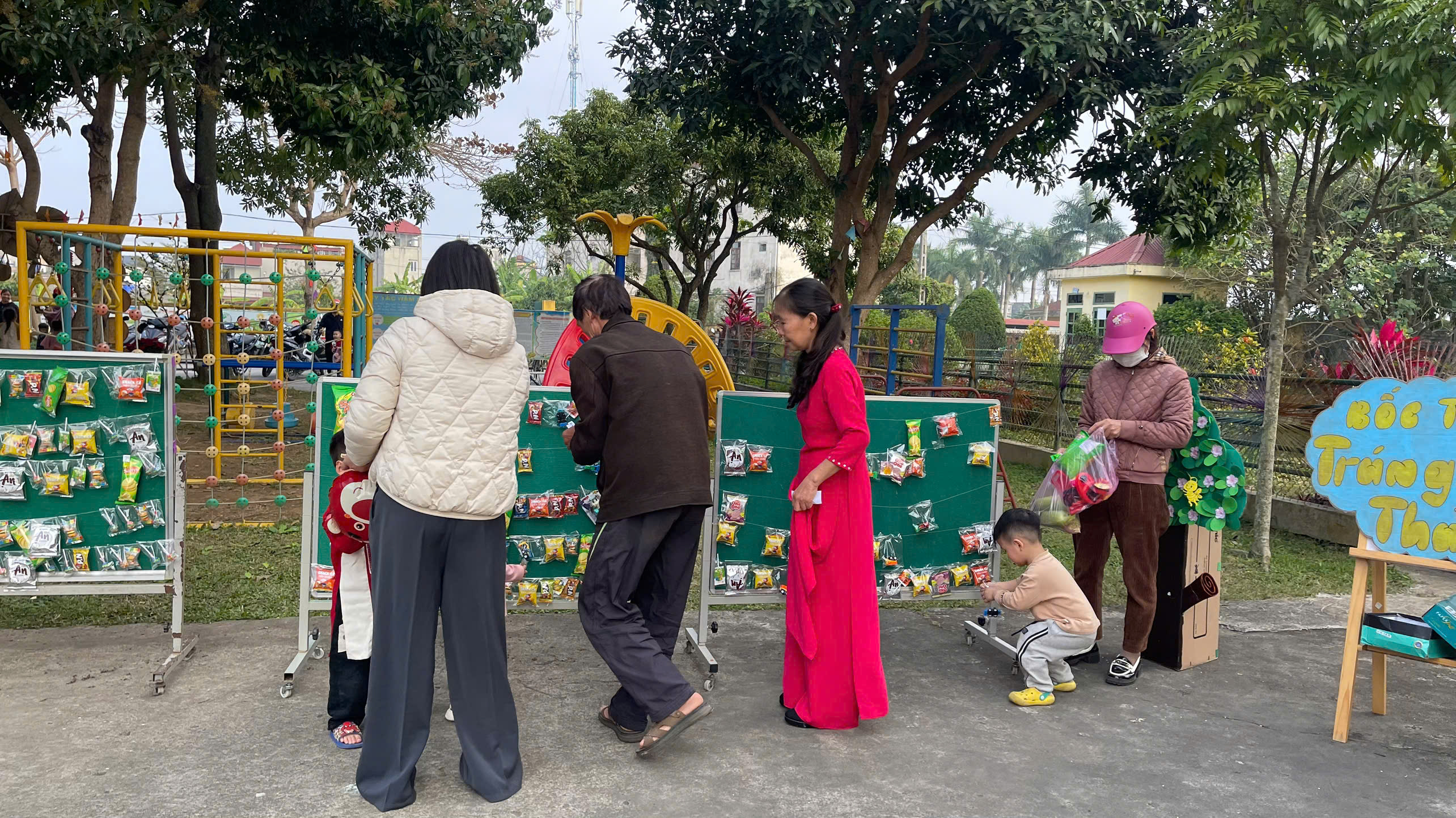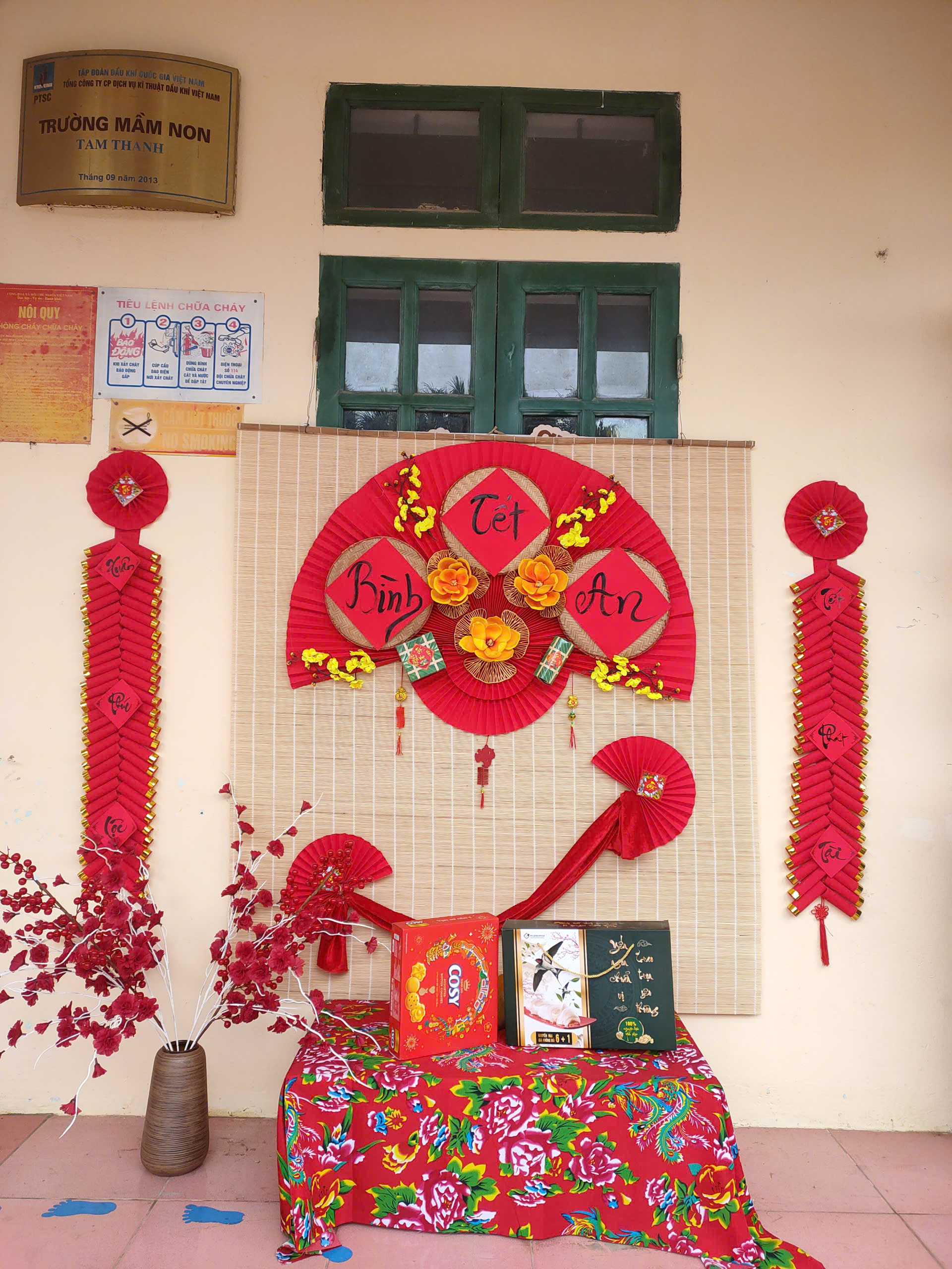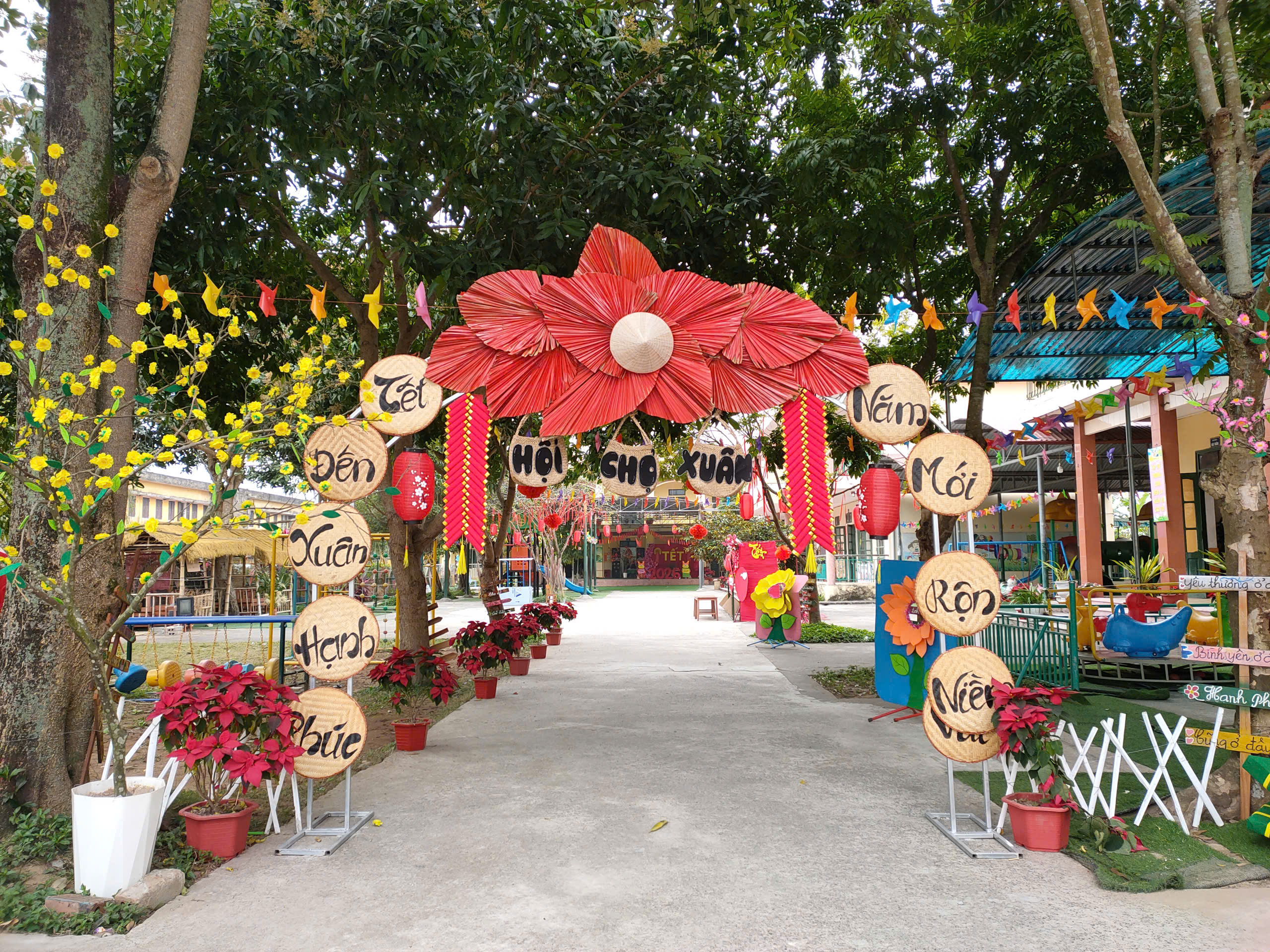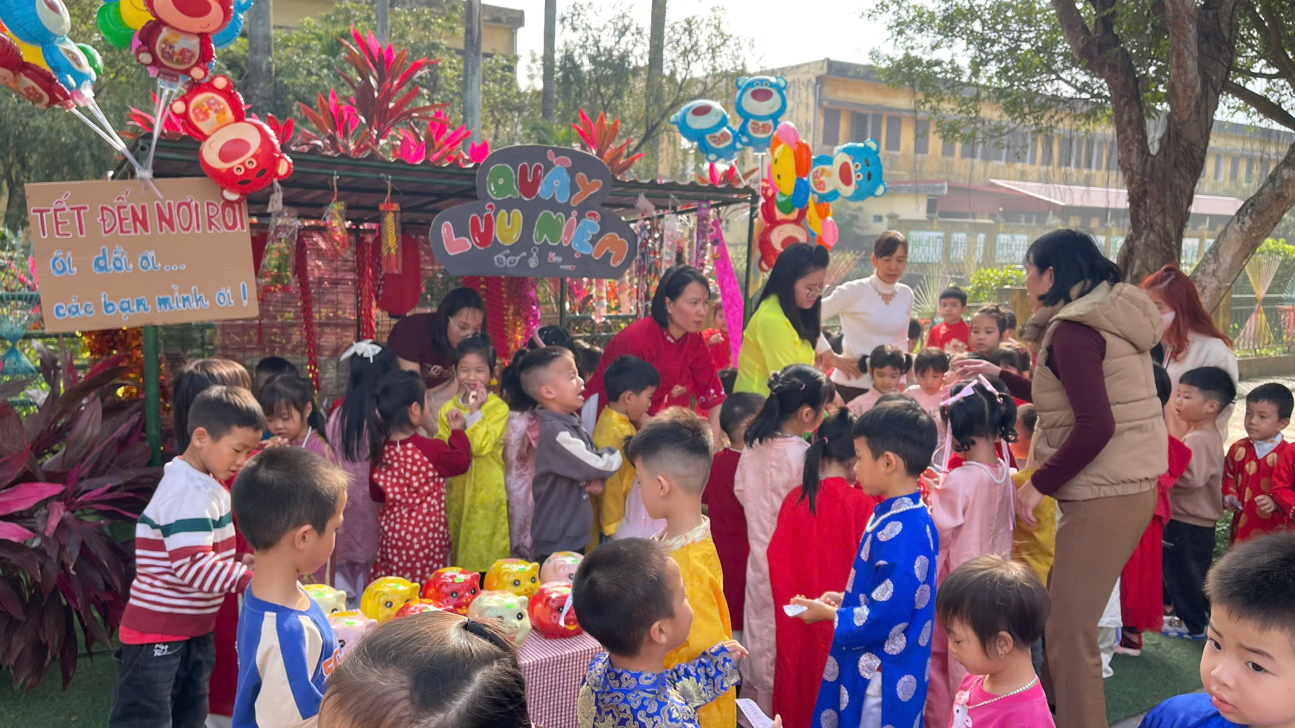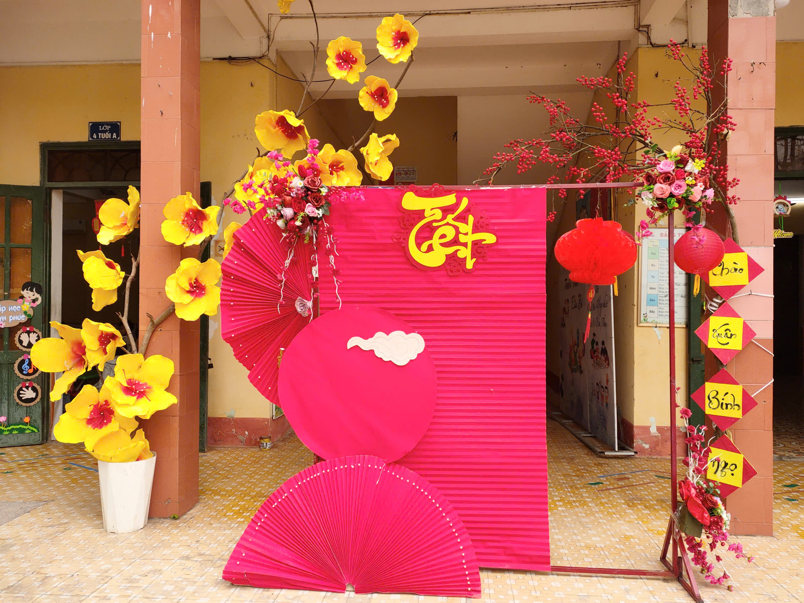 Trong công tác chuẩn bị, nhà trường đã chỉ đạo giáo viên xây dựng kế hoạch tổ chức các hoạt động Tết phù hợp với từng độ tuổi. Không gian lớp học và khuôn viên trường được trang trí rực rỡ với hoa mai, hoa đào, bánh chưng xanh…tạo nên không khí ấm áp, gần gũi của ngày Tết quê hương. Giáo viên tích cực làm đồ dùng, đồ chơi, trang trí khuôn viên trường lớp để phục vụ cho các hoạt động trải nghiệm của trẻ.